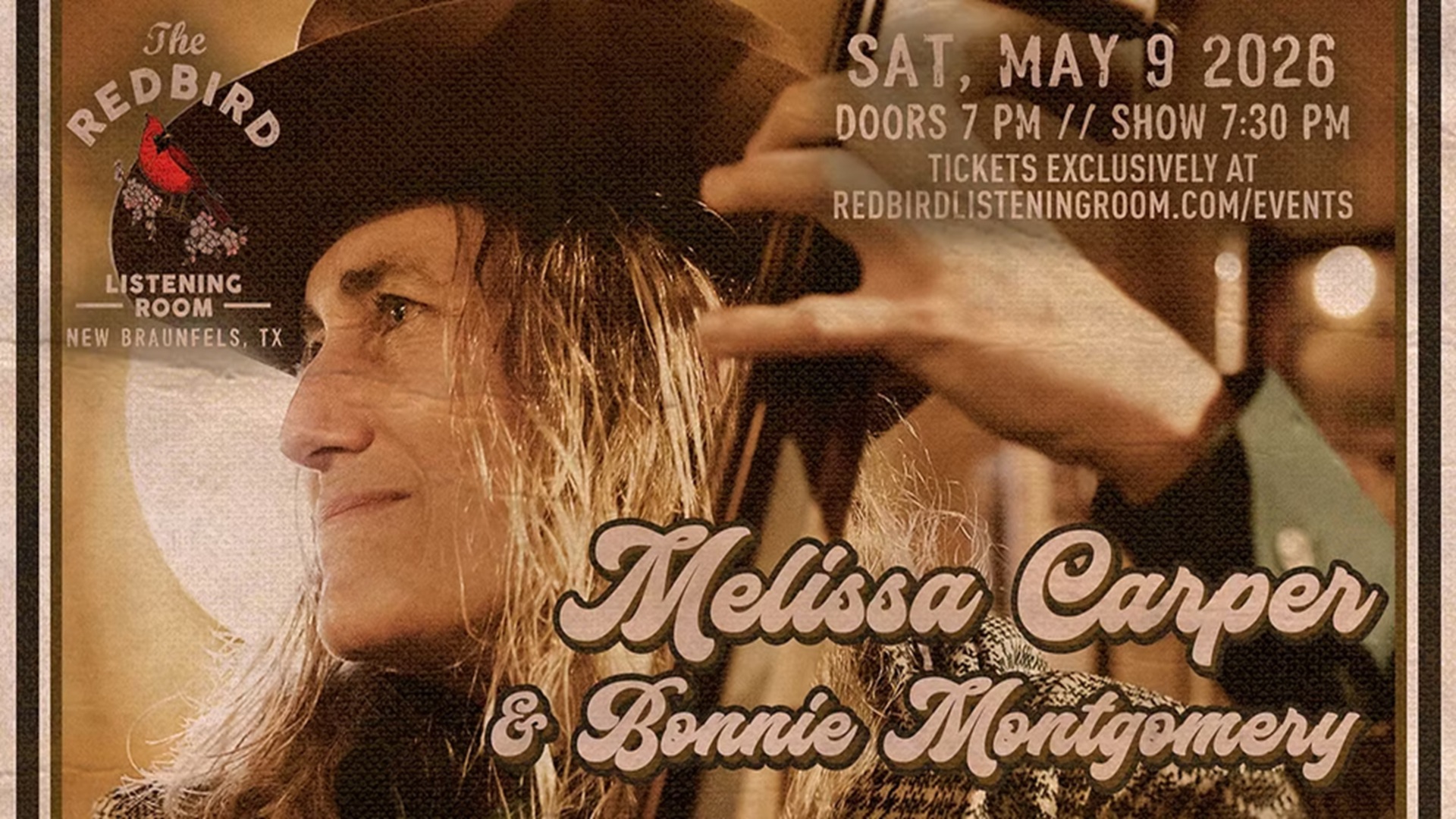 May 9 Melissa Carper & Bonnie Montgomery Live at The Redbird Listening Room 7:30 pm - 10:30 pm The Redbird Listening Room 1260 FM306 Suite D, New Braunfels Event Details Get Directions
