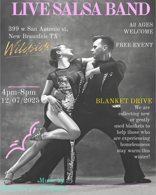 Salsa Y Sabor Latin Night will host their blanket drive on Sunday, December 7, from 4-8 pm at the Wildside Bar, located at 300 W. San Antonio Street. They are accepting new or gently used blankets to help those who are experiencing homelessness stay warm this winter. There will be a live salsa band, and Tejas Birria will be on site!